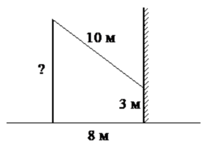 От столба к дому натянут провод длиной 10 м, который закреплён на стене дома на высоте 3 м от земли (см. рисунок). Найдите высоту столба, если расстояние от дома до столба равно 8 м. Ответ дайте в метрах.