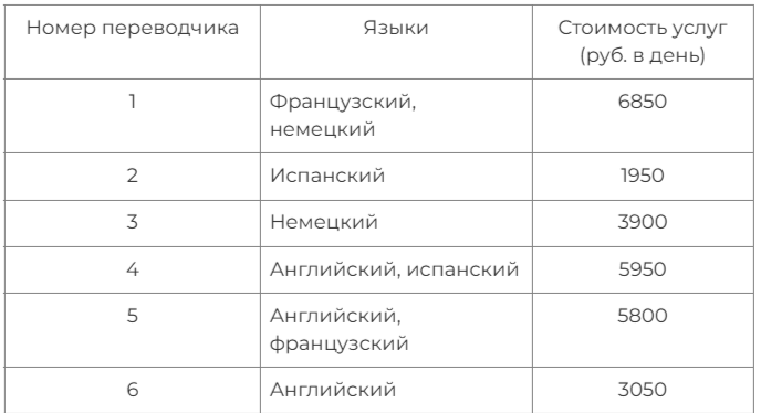 Пользуясь таблицей, соберите хотя бы одну группу, в которой переводчики вместе владеют всеми четырьмя языками: английским, немецким, испанским и французским, а суммарная стоимость их услуг не превышает 12 000 рублей в день.