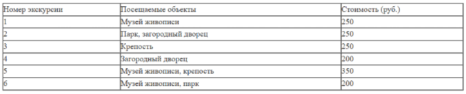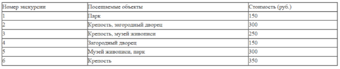 Пользуясь таблицей, подберите набор экскурсий так, чтобы турист посетил четыре объекта: крепость, загородный дворец, парк и музей живописи, а суммарная стоимость экскурсий не превышала 650 рублей.