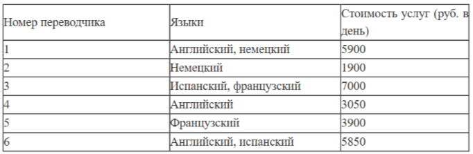 Для обслуживания международного семинара необходимо собрать группу переводчиков. Сведения о кандидатах представлены в таблице.