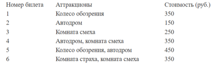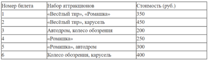 В городском парке имеется пять аттракционов: карусель, колесо обозрения, автодром, «Ромашка» и «Весёлый тир». В кассах продаётся шесть видов билетов, каждый из которых позволяет посетить один или два аттракциона. Сведения о стоимости билетов представлены в таблице.