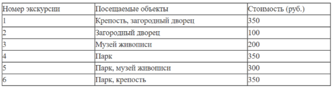 Пользуясь таблицей, подберите набор экскурсий так, чтобы турист посетил четыре объекта: крепость, загородный дворец, парк и музей живописи, а суммарная стоимость экскурсий не превышала 700 рублей.