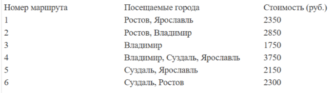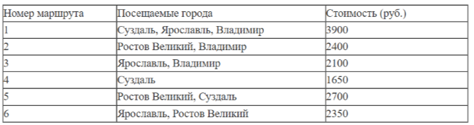 Путешественник из Москвы хочет посетить 4 города Золотого кольца России: Владимир, Ярославль, Суздаль и Ростов Великий. Турагентство предлагает маршруты с посещением некоторых городов Золотого кольца. Сведения о стоимости билетов и маршрутах представлены в таблице.