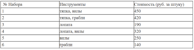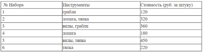 Для обработки дачного участка дачнику необходимо приобрести: лопату, тяпку, вилы и грабли. В магазине продаются наборы инструментов, некоторые наборы состоят только из одного инструмента. Цены приведены в таблице.