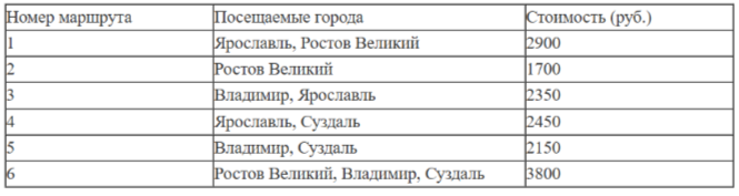 Путешественник из Москвы хочет посетить четыре города Золотого кольца России: Владимир, Ярославль, Суздаль и Ростов Великий. Турагентство предлагает маршруты с посещением некоторых городов Золотого кольца. Сведения о стоимости билетов и маршрутах представлены в таблице.