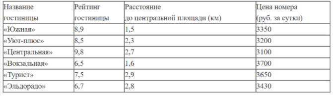 Любовь Игнатьевна собирается в туристическую поездку на трое суток в некоторый город. В таблице дана информация о гостиницах в этом городе со свободными номерами на время её поездки.