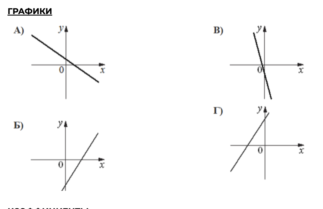 На рисунках изображены графики функций вида y=kx+b . Установите соответствие между графиками функций и знаками коэффициентов k и b .