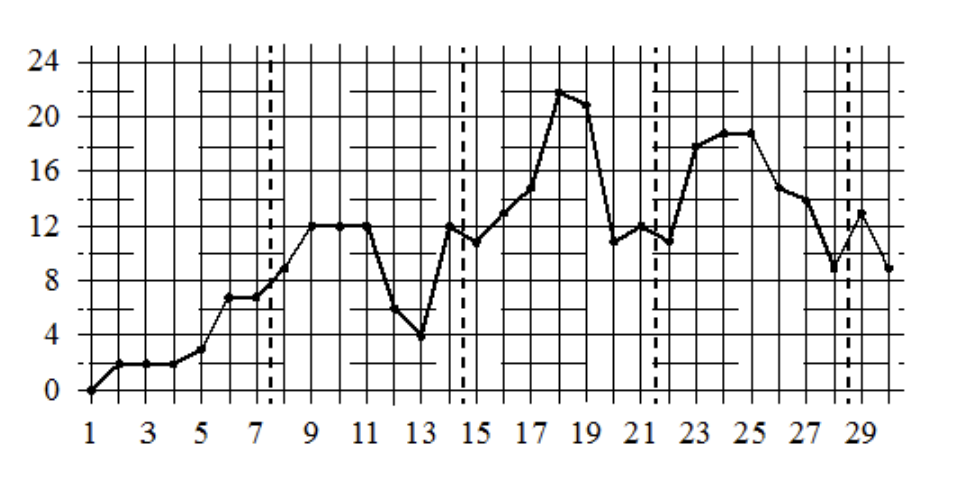 в Челябинске в апреле 2012 года. По горизонтали указываются числа месяца, по вертикали — температура в градусах Цельсия. Для наглядности точки соединены линией. Границы периодов времени показаны штриховыми линиями.