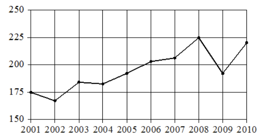 На рисунке точками показан годовой объём добычи угля в России открытым способом в период с 2001 по 2010 год. По горизонтали указан год, по вертикали — объём добычи угля в миллионах тонн. Для наглядности точки соединены линиями.