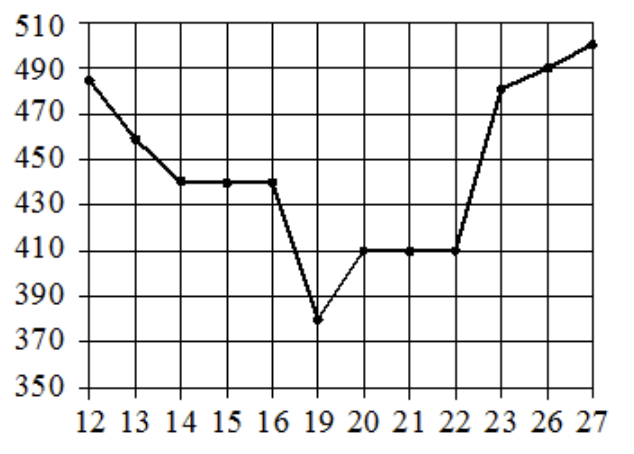 На рисунке показана цена акции компании на момент закрытия биржевых торгов во все рабочие дни в период с 12 по 27 марта 2013 года. По горизонтали указаны числа месяца, по вертикали — цена акции в рублях за штуку. Для наглядности точки соединены линиями.