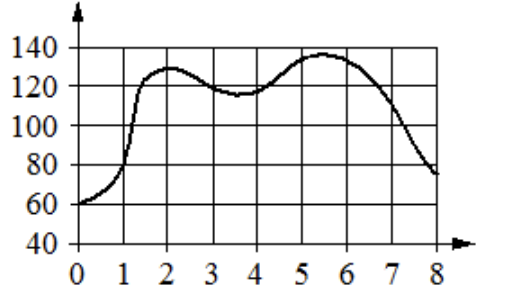 На графике изображена зависимость частоты пульса гимнаста от времени в течение и после его выступления в вольных упражнениях. На горизонтальной оси отмечено время (в минутах), прошедшее с начала выступления гимнаста, на вертикальной оси — частота пульса (в ударах в минуту).