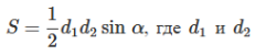 — длины диагоналей четырёхугольника, α — угол между диагоналями. Пользуясь этой формулой, найдите длину диагонали d2, если d1=11, sin α=1/8, a S=8,25.