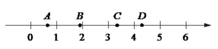 На координатной прямой отмечены точки 𝐴, 𝐵, 𝐶 и 𝐷.