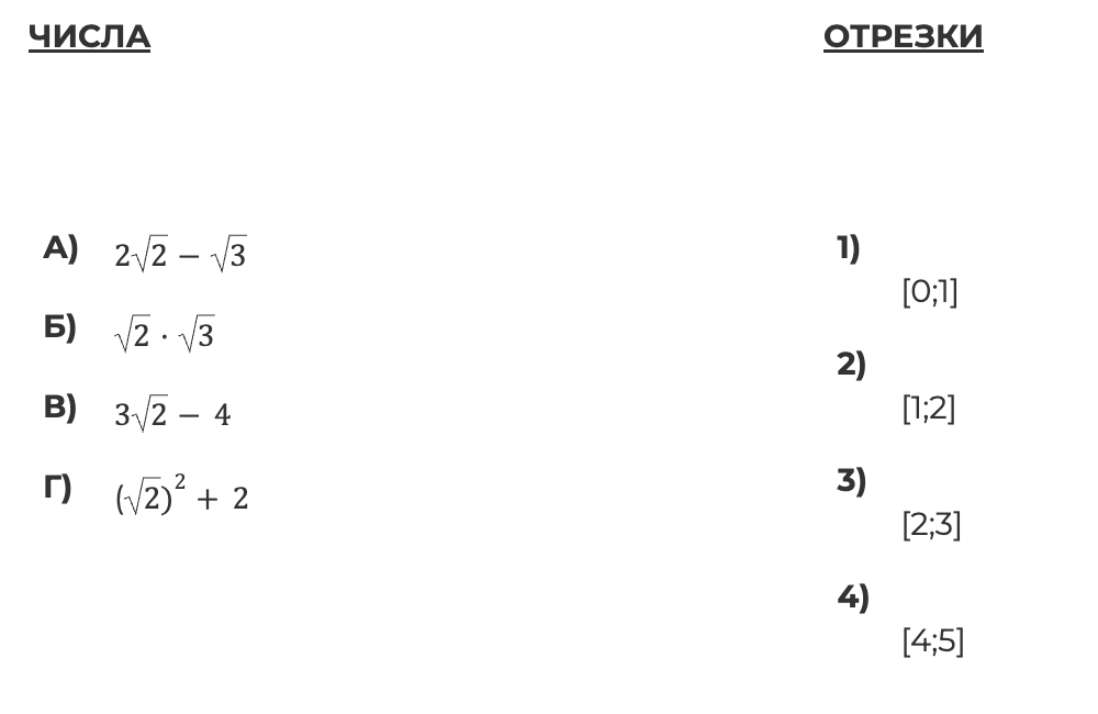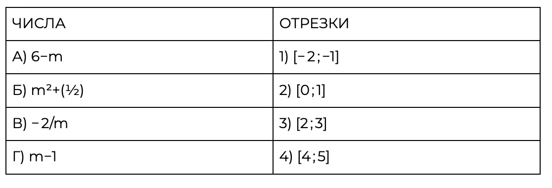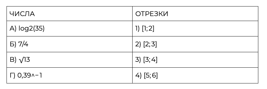 Каждому из четырёх чисел в левом столбце соответствует отрезок, которому оно принадлежит. Установите соответствие между числами и отрезками из правого столбца.