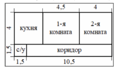 Квартира состоит из двух комнат, кухни, коридора и санузла (см. рисунок). Первая комната имеет размеры 4м×4,5м , вторая — 4м×4м , санузел имеет размеры 1,5м×1,5м , длина коридора 10,5 м. Найдите площадь кухни (в квадратных метрах).