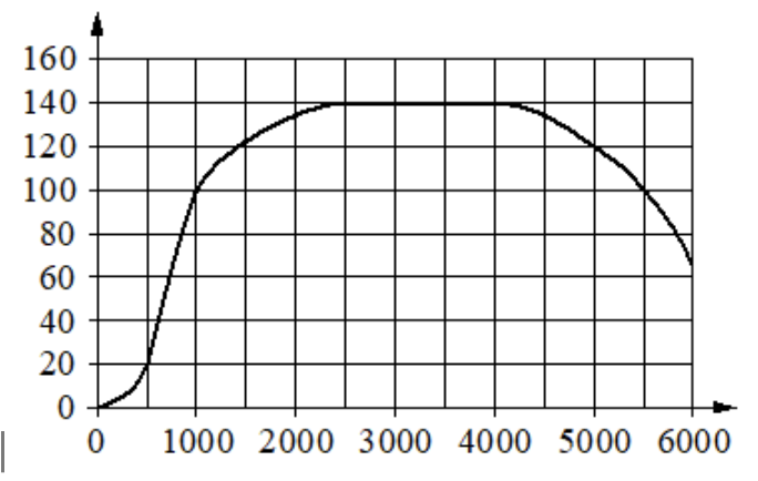 На графике показана зависимость крутящего момента автомобильного двигателя от числа оборотов в минуту. На горизонтальной оси отмечено число оборотов в минуту, на вертикальной оси — крутящий момент в Н⋅м. Чтобы автомобиль начал движение, крутящий момент должен быть не меньше 20 Н⋅м.