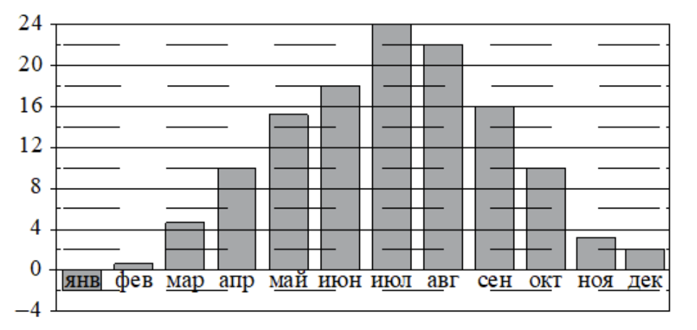 На диаграмме показана среднемесячная температура воздуха в Симферополе за каждый месяц 1988 года. По горизонтали указаны месяцы, по вертикали — температура (в градусах Цельсия).