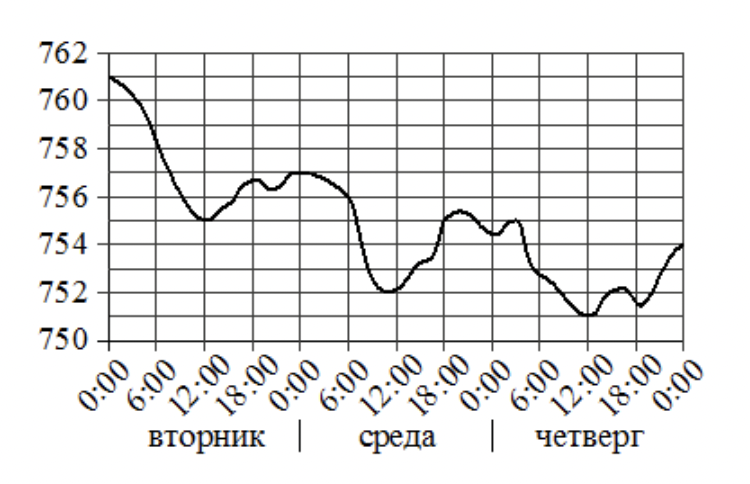На рисунке показано изменение атмосферного давления в течение трёх суток. По горизонтали указаны дни недели и время, по вертикали — значения атмосферного давления в миллиметрах ртутного столба.