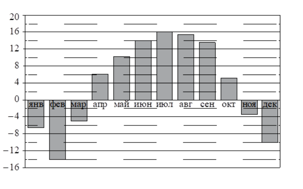 На диаграмме показана среднемесячная температура воздуха в городе Кстове Нижегородской области за каждый месяц 2023 года. По горизонтали указываются месяцы, по вертикали — температура (в градусах Цельсия).