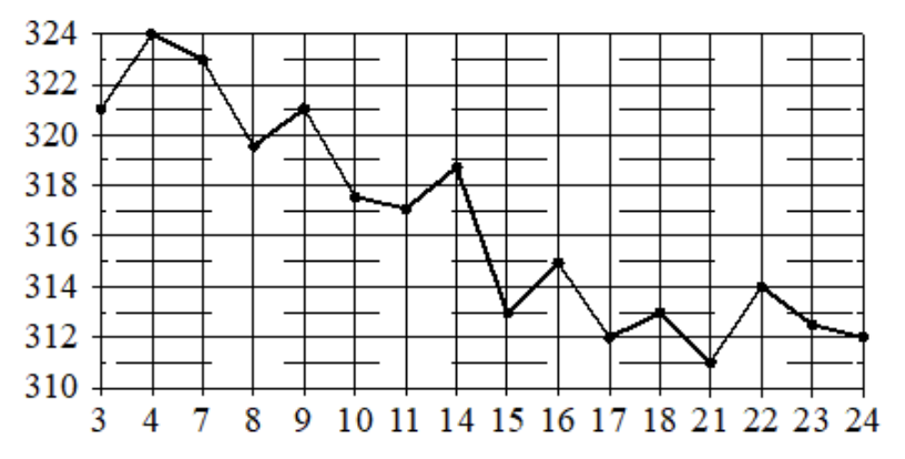 На рисунке жирными точками показана цена золота на момент закрытия биржевых торгов во все рабочие дни с 3 по 24 октября 2002 года. По горизонтали указаны числа месяца, по вертикали — цена золота (в долларах США) за унцию. Для наглядности жирные точки на рисунке соединены линиями.