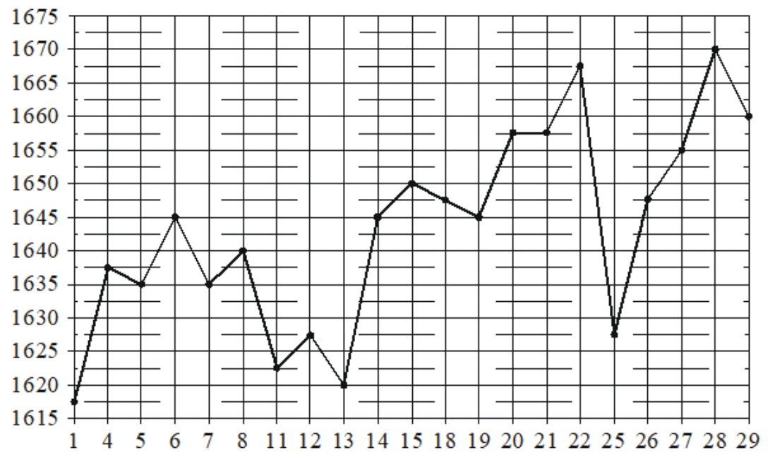 На рисунке жирными точками показана цена платины, установленная Центробанком РФ во все рабочие дни в октябре 2010 года. По горизонтали указаны числа месяца, по вертикали — цена платины (в рублях) за грамм.