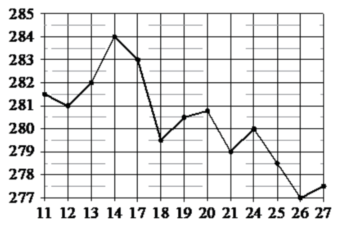 На рисунке жирными точками показана цена золота на момент закрытия биржевых торгов во все рабочие дни с 11 по 27 июля 2000 года. По горизонтали указаны числа месяца, по вертикали — цена унции золота в долларах США. Для наглядности жирные точки на рисунке соединены линиями.