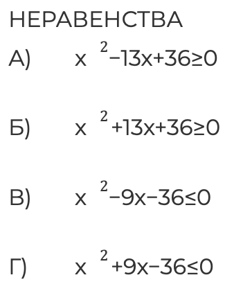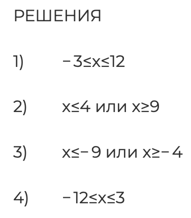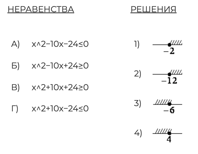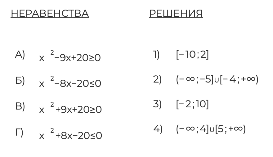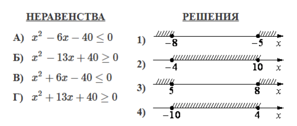 Каждому из четырёх неравенств в левом столбце соответствует одно из решений в правом столбце. Установите соответствие между неравенствами и их решениями.