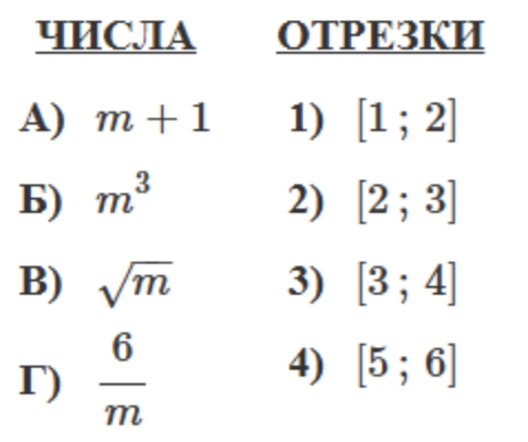 Число m равно √3.Каждому из четырёх чисел в левом столбце соответствует отрезок, которому оно принадлежит. Установите соответствие между числами и отрезкамииз правого столбца.
