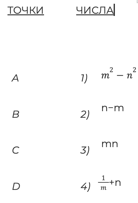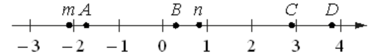 На координатной прямой отмечены числа m и n и точки A, B, C и D.