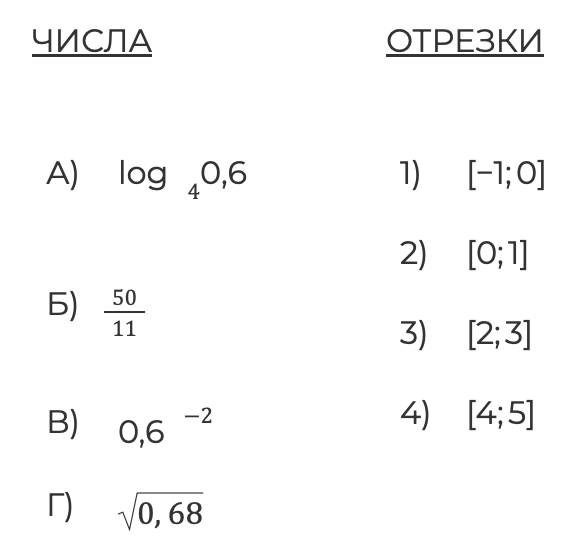 Каждому из четырёх чисел в левом столбце соответствует отрезок, которому оно принадлежит. Установите соответствие между числами и отрезками из правого столбца.