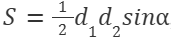 , где d1 и d2 – длины диагоналей четырёхугольника, α – угол между диагоналями, Пользуясь этой формулой, найдите площадь S, если d1=6, d2=14 и sin α=