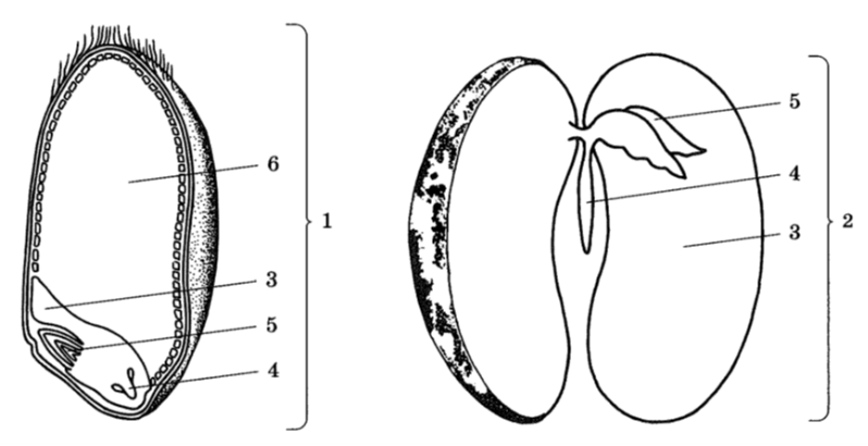 Установите соответствие между характеристиками и семенами или элементами их строения, обозначенными на рисунке цифрами 1, 2: к каждой позиции, данной в первом столбце, подберите соответствующую позицию из второго столбца.
