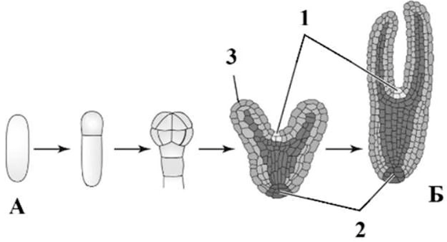 На схеме изображены начальные стадии развития двудольного растения с момента оплодотворения. Назовите объекты, обозначенные на рисунке буквами А и Б. Назовите структуры семени покрытосеменных растений, развивающиеся из участков 1, 2, 3. Какую функцию выполняет ткань, образующая структуры 1 и 2?