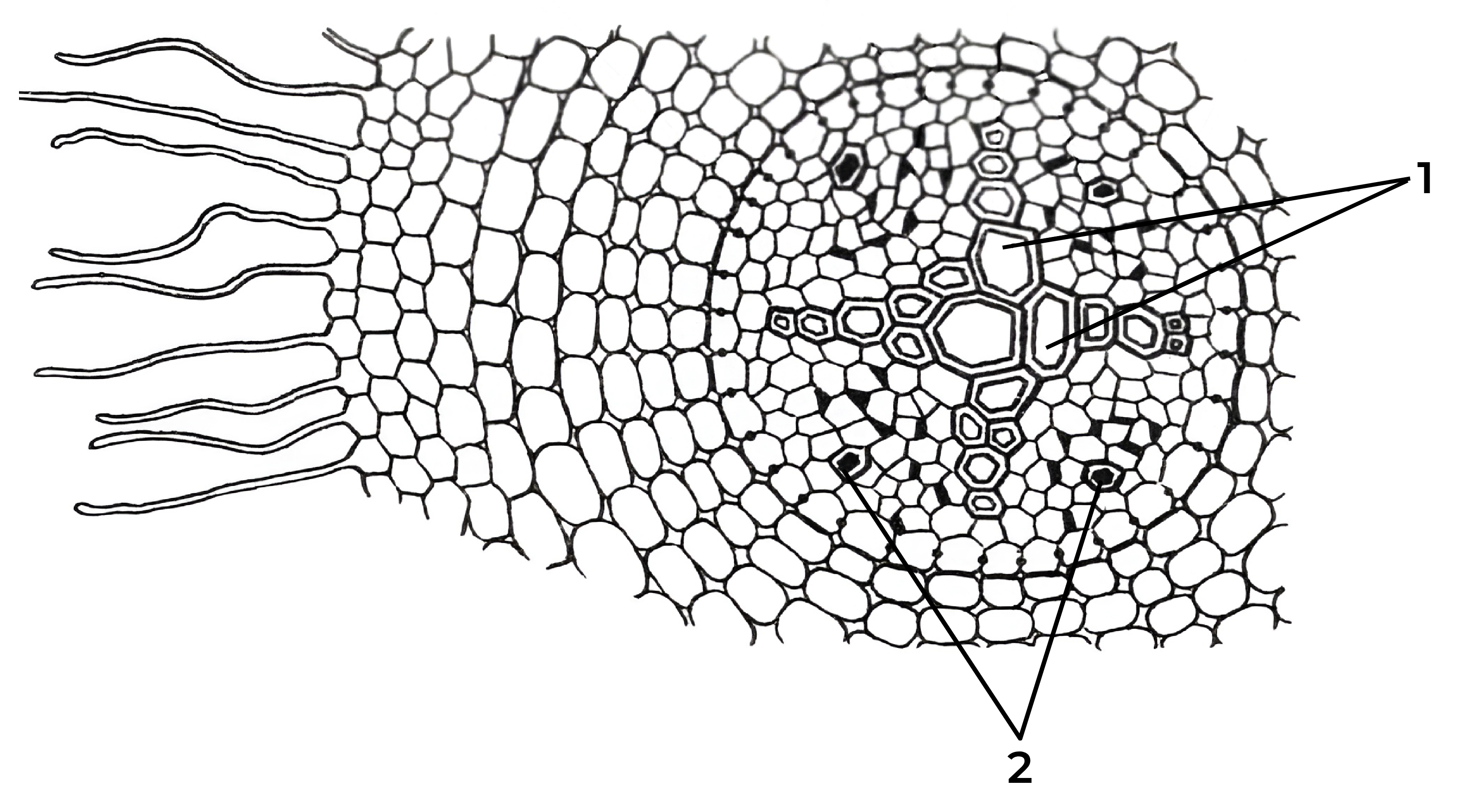 Назовите структуры анатомического строения корня, обозначенные на рисунке цифрами 1, 2. Укажите функцию каждой из них. В какой зоне корня сделан данный поперечный срез?