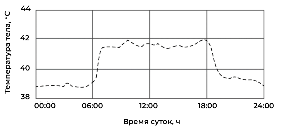 Экспериментатор изучал особенности физиологии птиц тауи из семейства Овсянковых, измеряя температуру тела в течение суток. Для этого он помещал птиц в камеру, где поддерживалась постоянная температура 23°C. В 6:00 он включал свет, а в 18:00 выключал. Результаты эксперимента представлены на графике.