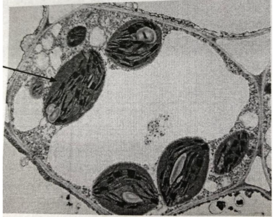 Какой клеточный органоид обозначен на микрофотографии вопросительным знаком? Как будет различаться количество этих органоидов в клетках ассимиляционной ткани и покровной ткани листа? Ответ поясните с учетом особенностей строения и функции каждого типа ткани.