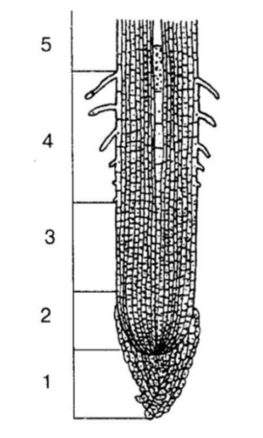 Какие структуры и зоны корня обозначены на рисунке цифрами 1, 3, 5? Какие функции они выполняют? Повреждение какой зоны корня (2–5) прекращает рост корня в длину? Ответ поясните.