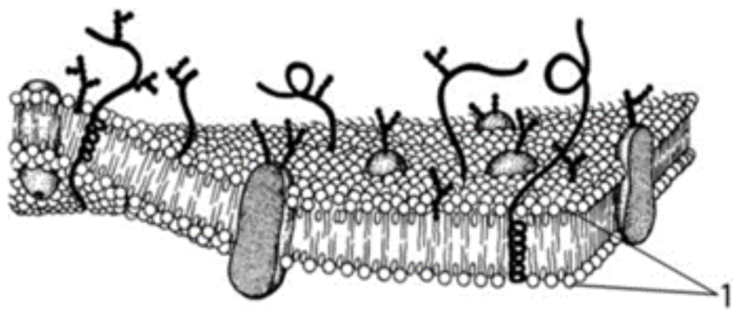 Определите клеточную структуру, модель строения которой изображена на рисунке. Молекулы какого вещества обозначены цифрой 1? Какова его основная функция в этой структуре? Какая особенность строения и какие свойства молекул этого вещества позволяют ему выполнять эту функцию? Как расположены молекулы данного вещества в представленной клеточной структуре?