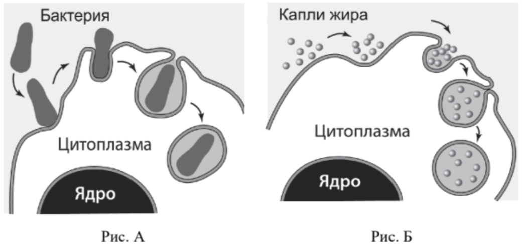 Какие процессы, сопровождающие питание амёбы, изображены на рис. А и Б? Назовите структуру клетки, непосредственно участвующую в этих процессах. Какие преобразования с бактерией произойдут далее в клетке амёбы (на рис. А)?