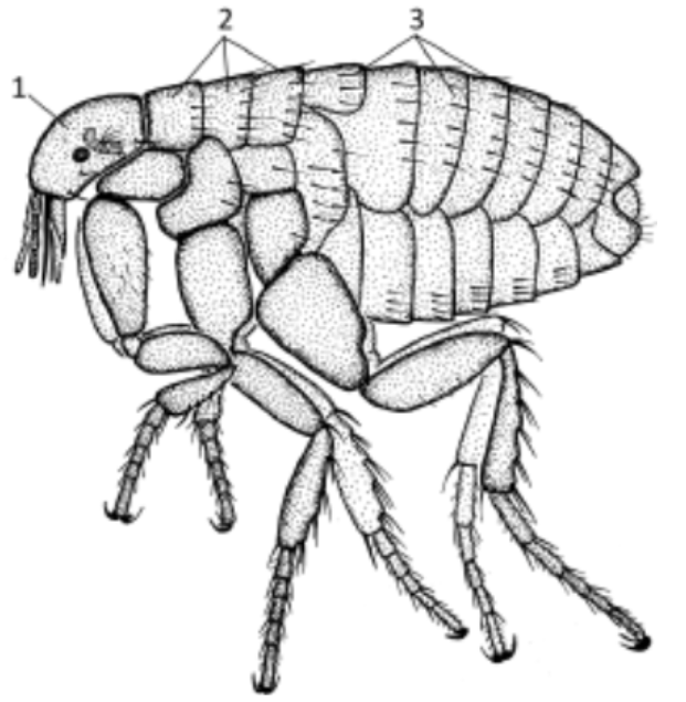На рисунке изображена блоха человеческая (Pulex irritans). К какому классу относят это животное? По каким признакам можно определить принадлежность блохи к этому классу? Укажите три признака. Какой цифрой обозначена грудь животного? Ответ поясните. Блохи - вторично бескрылые насекомые. Укажите причину такой особенности строения.