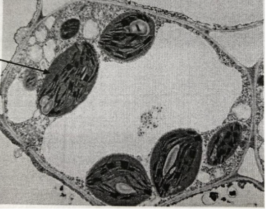 Какой клеточный органоид обозначен на микрофотографии вопросительным знаком? Как будет различаться количество этих органоидов в клетках ассимиляционной ткани и покровной ткани листа? Ответ поясните с учетом особенностей строения и функции каждого типа ткани.