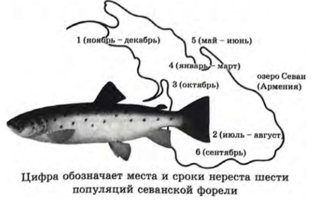 Определите по рисунку вид изоляции севанской форели, приведший к образованию различных популяций. Ответ обоснуйте. Почему учёные относят эти популяции к одному виду? Почему севанская форель требует пристального внимания со стороны природоохранных организаций?
