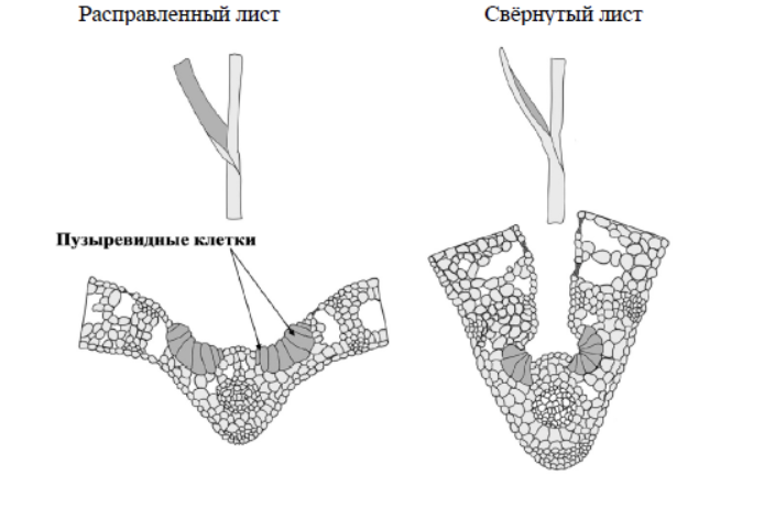 В эпидерме листьев мятлика лугового (Poa pratensis) и некоторых других злаков имеются особые живые пузыревидные клетки, которые располагаются в районе центральной жилки. Пузыревидные клетки принимают участие в сворачивании листьев. В каких условиях происходит сворачивание листьев у мятлика? Каким образом в этом процессе участвуют пузыревидные клетки? Укажите два значения сворачивания листьев у мятлика лугового (считайте, что большинство устьиц находится на верхней стороне листа). Ответ поясните.