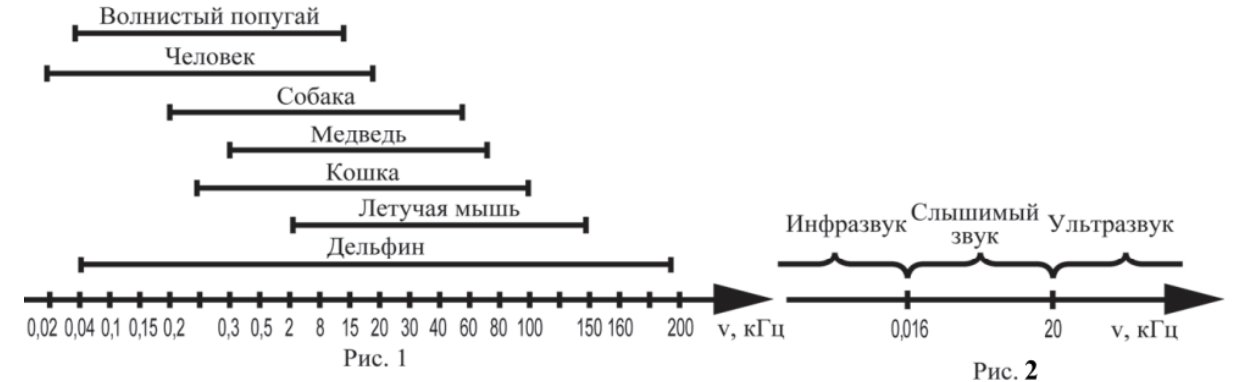 Характеристики любого звука – высота и сила звучания. Высота звука определяется количеством колебаний звуковой волны и выражается в герцах (Гц). Звук с частотой меньше 0,016 кГц называют инфразвуком, а свыше 20 кГц – ультразвуком. Как ультразвук, так и инфразвук человеческим ухом не воспринимаются, однако многие животные их слышат и общаются в ультразвуковом диапазонах. На рис. 1 представлены диапазоны слышимых звуков для разных животных, а на рис. 2 – диапазоны, приходящиеся на инфразвук, слышимый звук и ультразвук.