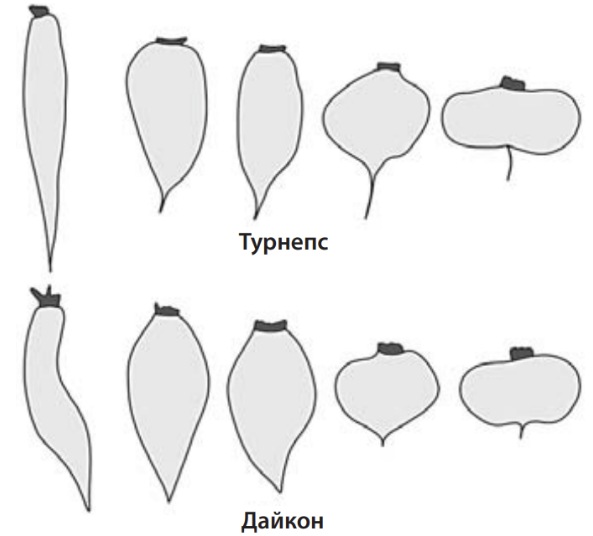 У дайкона и турнепса (семейство Капустные) корнеплоды характеризуются сходной наследственной изменчивостью в строении — от удлиненной формы до уплощенной. Какой биологический закон иллюстрирует данная закономерность? Сформулируйте этот закон на примере изображённых корнеплодов. К какой форме эволюционного процесса можно отнести данный пример? Почему сравнение между вариантами корнеплода турнепса и подобными вариантами клубня картофеля нельзя рассматривать в качестве проявления проиллюстрированного закона?