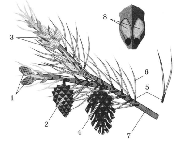 Каким номером на рисунке обозначен укороченный побег сосны с чешуевидными и игловидными листьями?