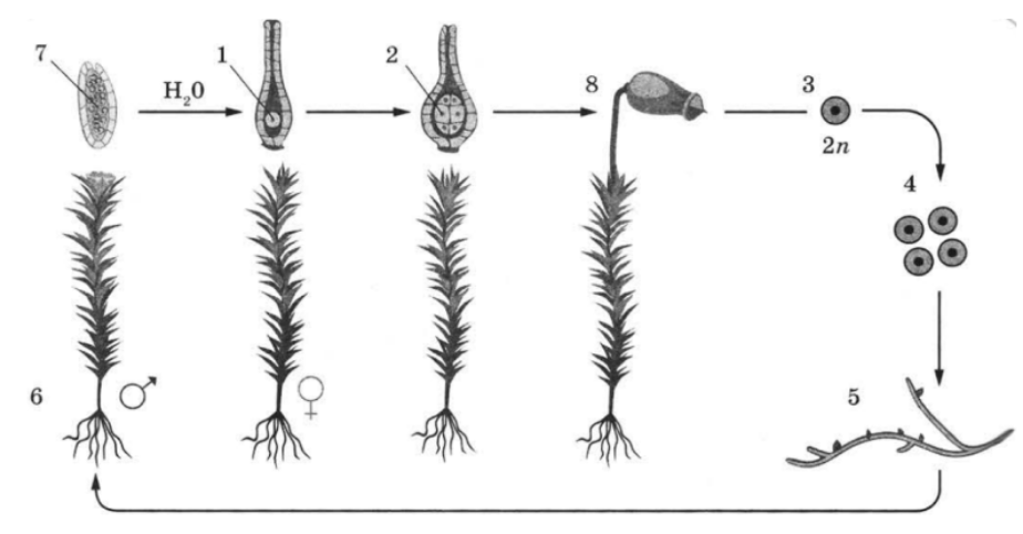 Каким номером на рисунке обозначена стадия жизненного цикла мха, перед которой происходит редукционное деление?