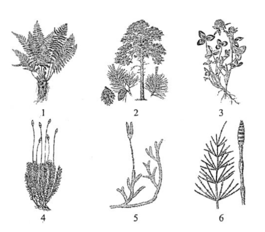 Каким номером на рисунке обозначено растение, у которого предназначенные для размножения клетки созревают в коробочке?