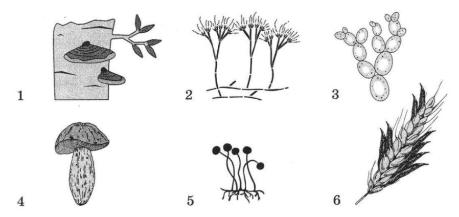 Установите соответствие между характеристиками и грибами, обозначенными на рисунке цифрами 1, 2, 3, 4: к каждой позиции, данной в первом столбце, подберите соответствующую позицию из второго столбца.
