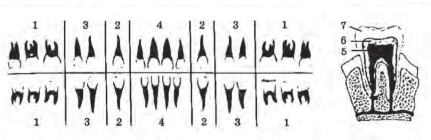 Каким номером на рисунке обозначена эмаль зуба человека?
